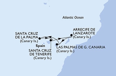 Маршрут круиза: Фуншал, о. Мадейра - Аресифи, о. Лансароте - Аресифи, о. Лансароте - море - Лас-Пальмас, о. Гран-Канария - Санта-Крус-де-ла-Пальма, о. Ла-Пальма - Санта-Крус-де-Тенерифе, о. Тенерифе - Пуэрто-дель-Росарио, о. Фуэртевентура - Фуншал, о. Мадейра