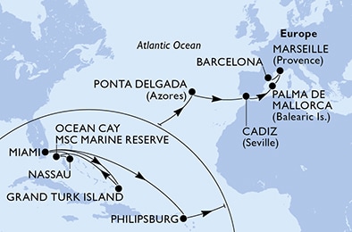 Маршрут круиза: Майами - море - о. Гранд-Терк - море - о. Оушен Кей - Нассау - Майами - море - море - Филипсбург, о. Синт-Мартен - море - море - море - море - море - Понта-Делгада, о.Сан-Мигел - море - море - Кадиc / Севилья - море - о. Майорка - Марсель - Барселона